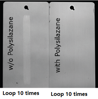 Polysilazane can also be used as a scratch-resistant resin for pigmented coatings. As shown in the figure, in the same scratch test, a titanium dioxide-based white coating containing a polysilazane resin (shown above, right) exhibits excellent scratch resistance, while the control, a coating without polysilazane, is severely scratched.
