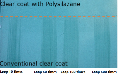 The image shows a scratch test conducted on a metal substrate coated with a color paint layer and a polyurethane clearcoat. The upper portion of the substrate was further coated with a polysilazane hardcoat. The polysilazane-coated area exhibited excellent scratch resistance after 500 scratch cycles, while the uncoated area showed noticeable scratch marks even after 10 cycles.
